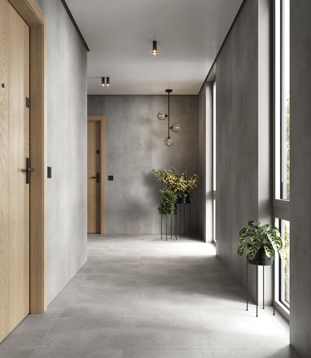 חיפוי קיר מינרלי SPC Idevo Smoky Concrete מגיע בגוון אפור בהיר מונוכרומטי. העיצוב הנקי מאפשר חופש רחב בשילוב רהיטים ואביזרי עיצוב נוספים, ומתאים כמעט לכל סגנון עיצוב פנים.