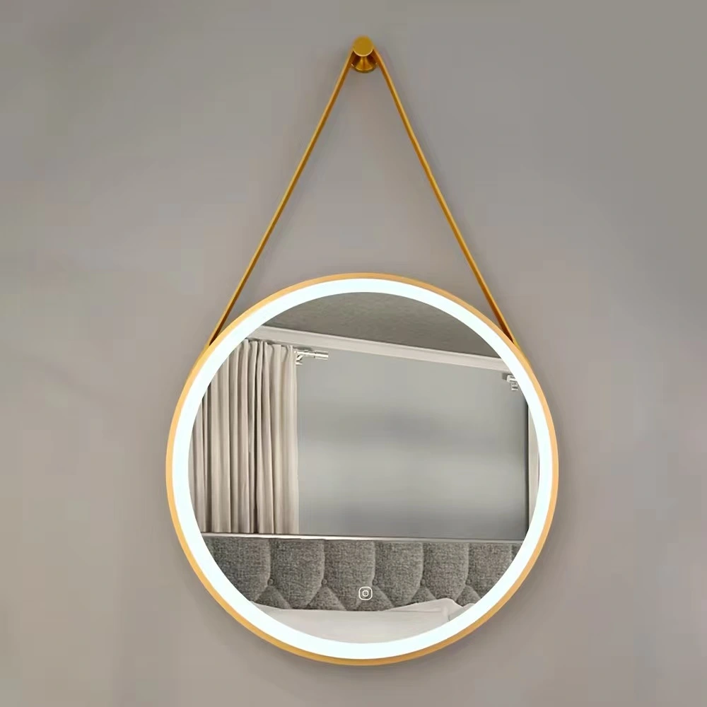 מראת לד עגולה בקוטר 60 ס"מ עם רצועת תלייה מעוצבת בגימור זהב יוקרתי. השילוב בין מסגרת זהב עדינה לבין תאורת LED היקפית יוצר מראה אלגנטי ומרשים לקיר.
