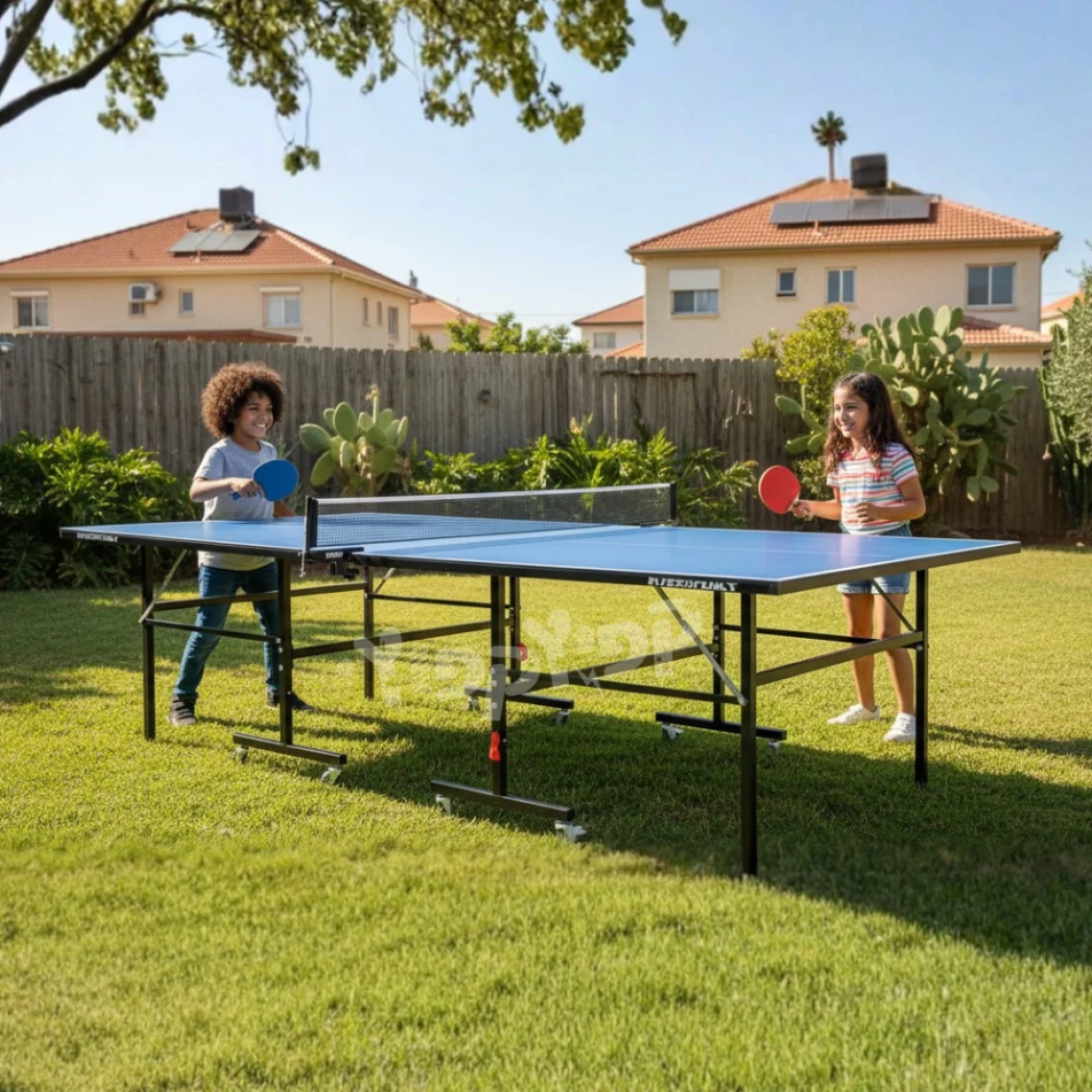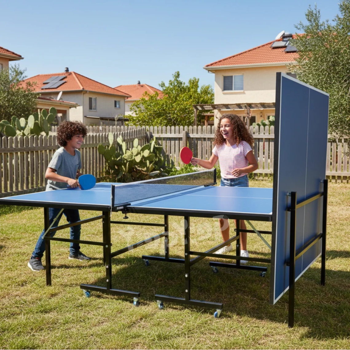 שולחן פינג פונג איכותי בצבע כחול לשימוש חיצוני, בגודל מלא, מבית DERBY. מתאים לגינה, מרפסת או כל חלל חיצוני, ומספק חוויית משחק מהנה, יציבה ונוחה לכל המשפחה.