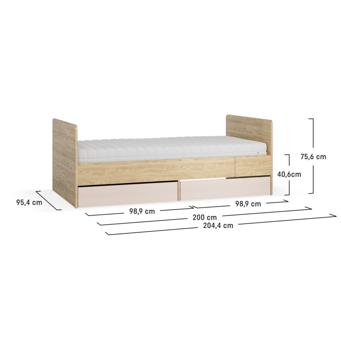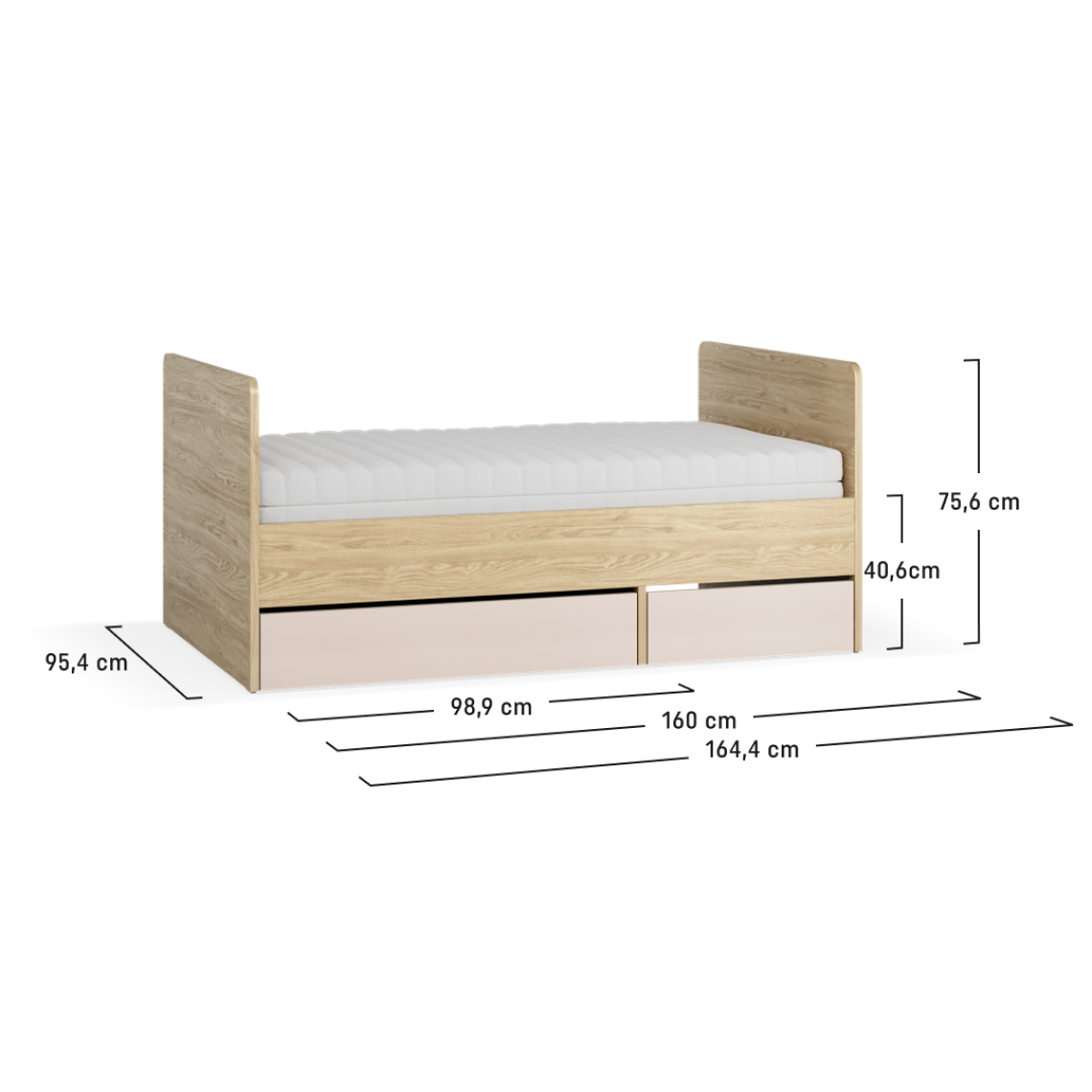 • ניתן להאריך את המיטה בנוחות, מה שמגדיל את אורכה. הגרסה הקצרה יותר מתאימה למזרן בגודל 90x160 ס"מ, וכאשר היא פתוחה, למזרן סטנדרטי בגודל 90x200 ס"מ. זהו פתרון פרקטי המאפשר לכם ליהנות ממיטה אחת במשך שנים רבות.