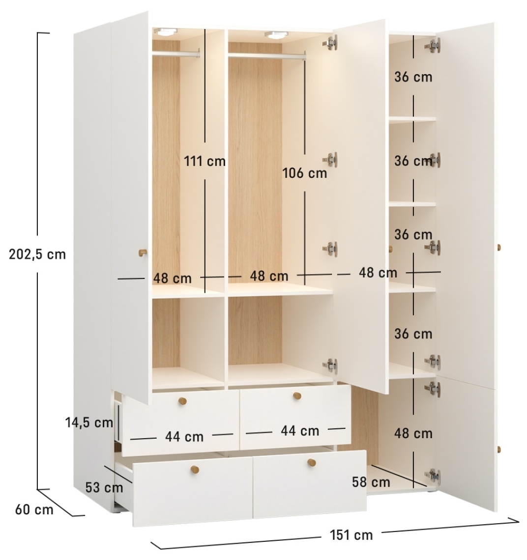 • הפנים המגוון של ארון הבגדים 3 דלתות Reli מאפשר לך לארגן בנוחות את הבגדים שלך בהתאם לצרכים הנוכחיים שלך. בחלקו השמאלי והאמצעי יש מעקות לבוש תלויים ומדפים מתכווננים. ניתן להזיז את המוטות למטה כדי לאפשר לילדים להשתמש בארון הבגדים באופן עצמאי. נוחות השימוש מובטחת על ידי נורות LED מובנות הנדלקות בעת פתיחת הדלת. יש להם מנגנון סגירה שקט.