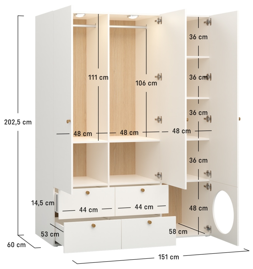 ארון ה-3 דלתות מקולקציית Reli יכיל בקלות את כל בגדי המתבגר ואקססוריז נוספים. הודות ל-4 מגירות מרווחות, הוא יכול לשמש גם כרהיט לשני ילדים. תאורת LED פנימית תקל על מציאת זוג הגרביים האהוב עליך, ומדפים מתכווננים יתאימו לגודל הפריטים המאוחסנים. בבחירת צבע הקירות האחוריים, תחתיות המגירות והידיות של ארון הבגדים, תתאימו אותו לעיצוב ולהעדפות הילד.