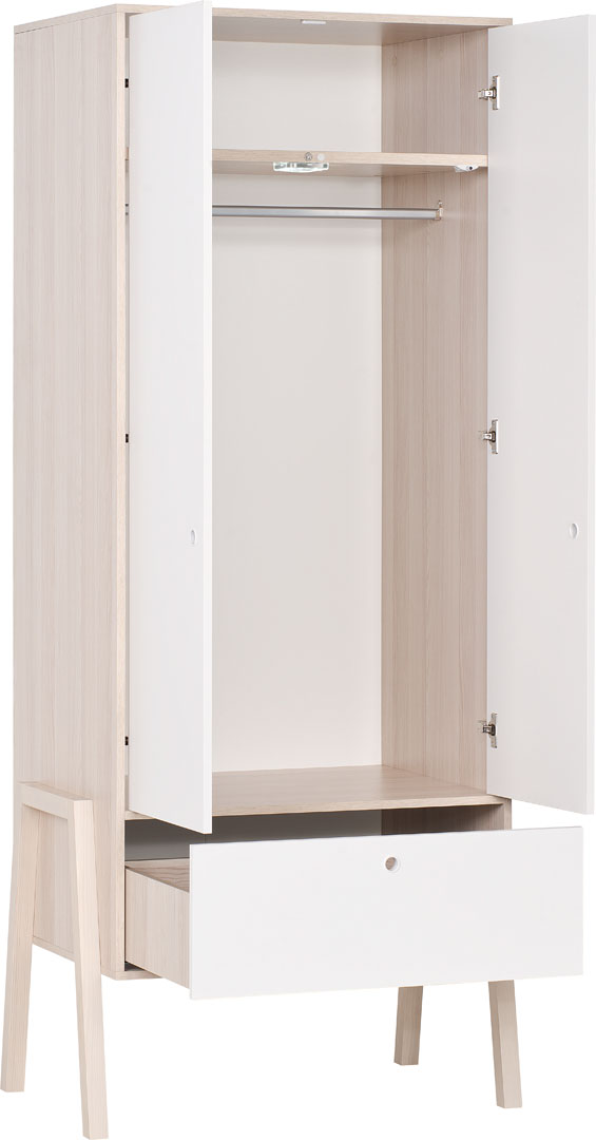 • ארון 2 דלתות ספוט עם מדף, מתלה ומגירה. לרהיט תאורה מובנית ורגליים גבוהות המקלות על ניקיון החדר.